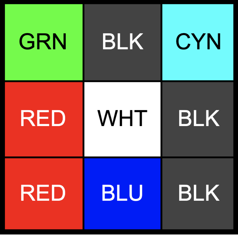 Each subgrid gave a color just like each square, suggesting we should view the subgrids as squares in a grand 3x3 metagrid. Translating every subgrid (and discarding the instruction row) gave this metagrid: