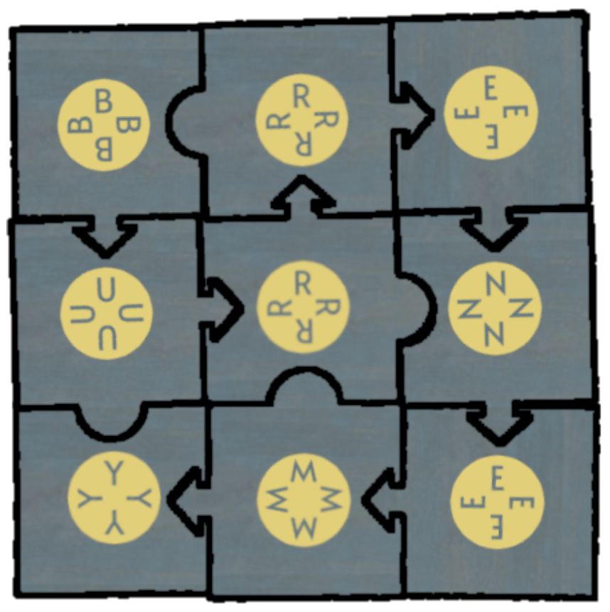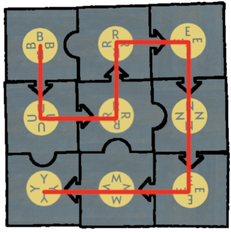 The arrows on each piece trace out a path through the completed puzzle. The letters along the path spell BURRENEMY.