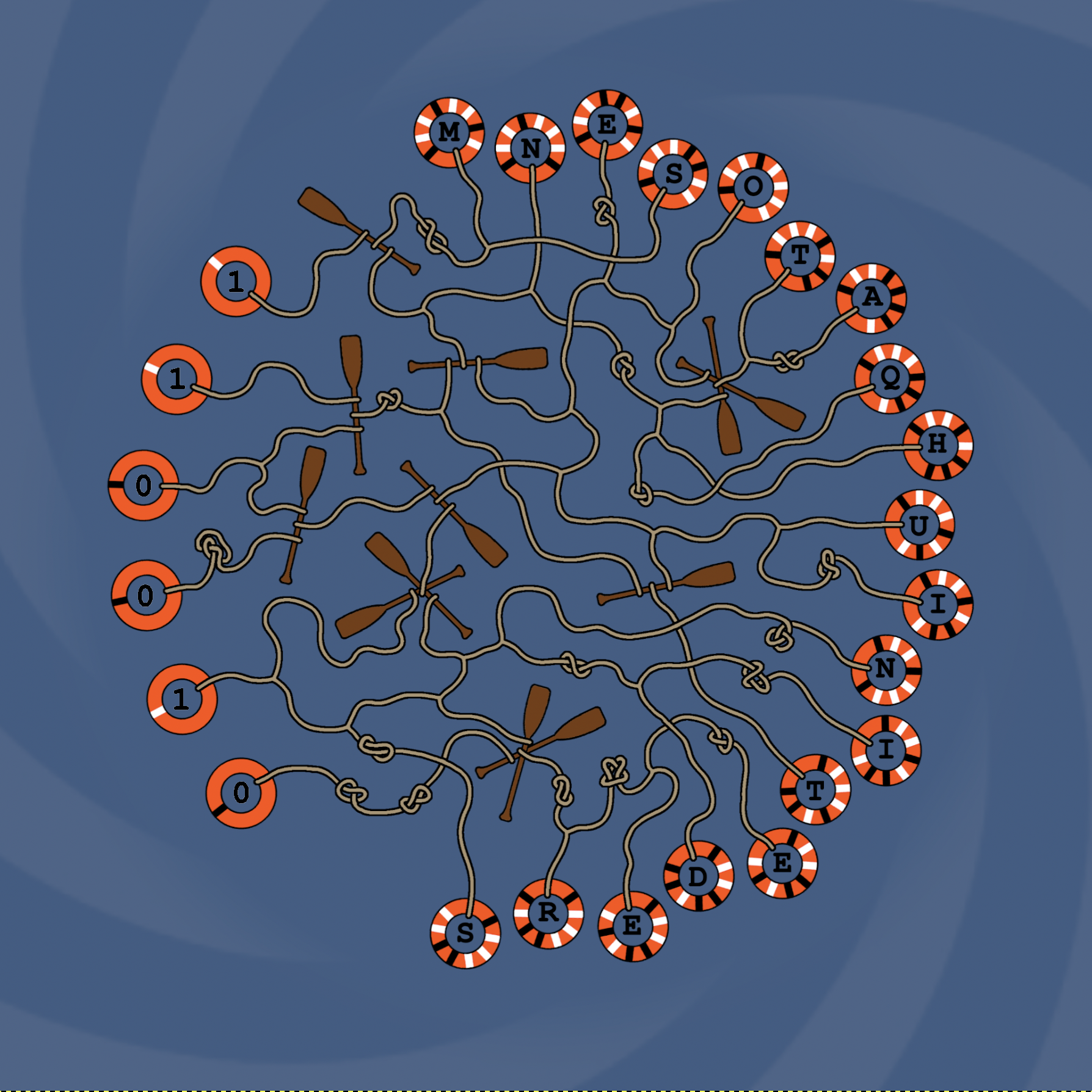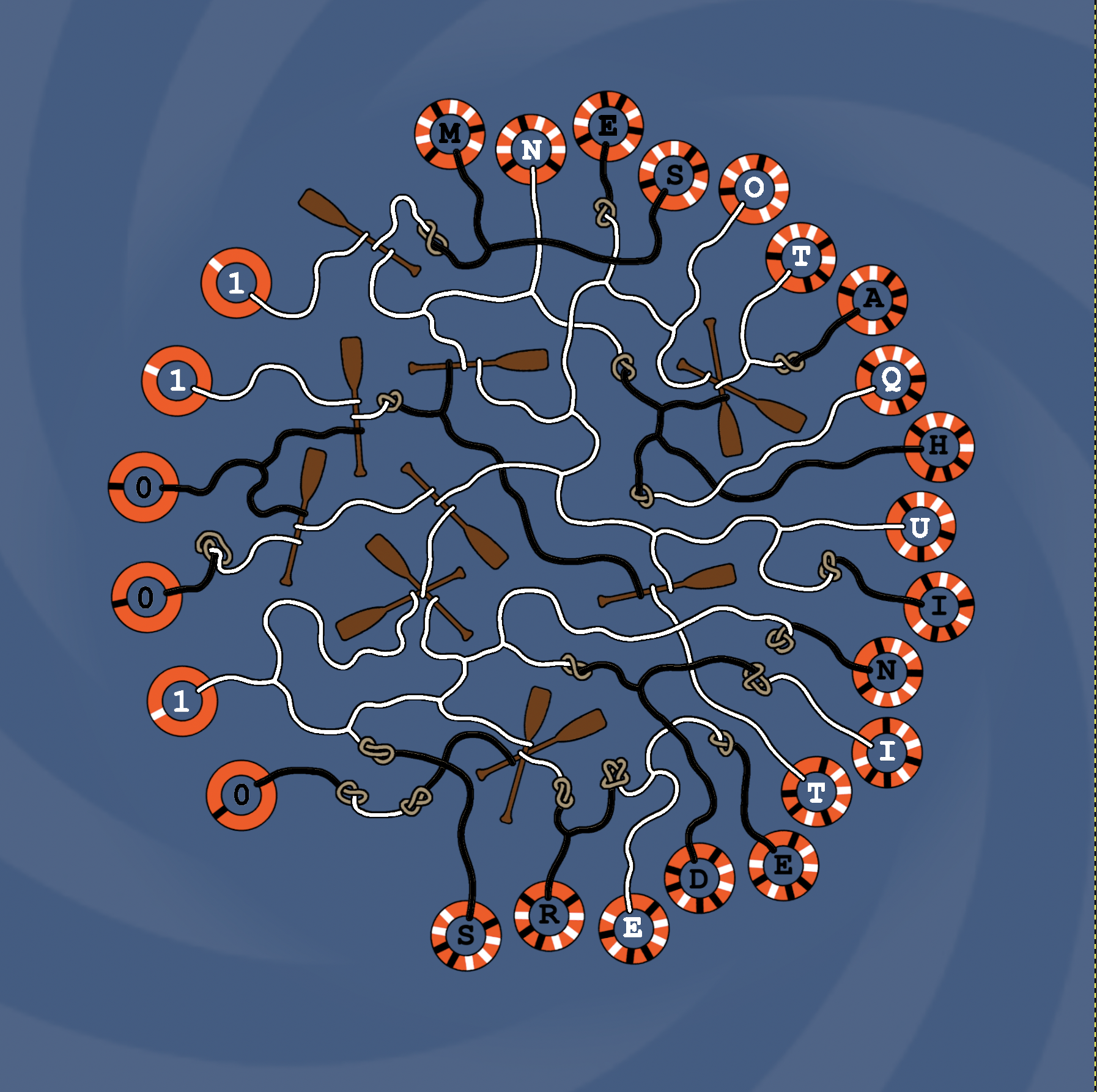 With this insight, you can work through the circuit, propagating bits gate by gate through the circuit until each lettered life ring is given either a zero or a one. Upon doing this and taking the letters corresponding to 1s, you get the phrase NOTQUITE, a sign they’re close but not quite right. This is shown below, with wires carrying 0s and 1s colored black and white respectively.