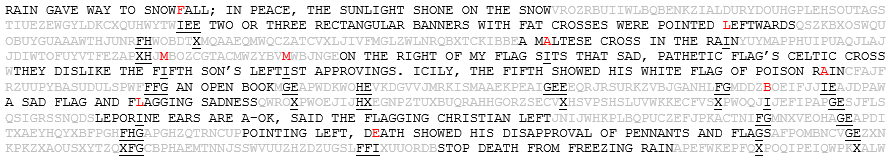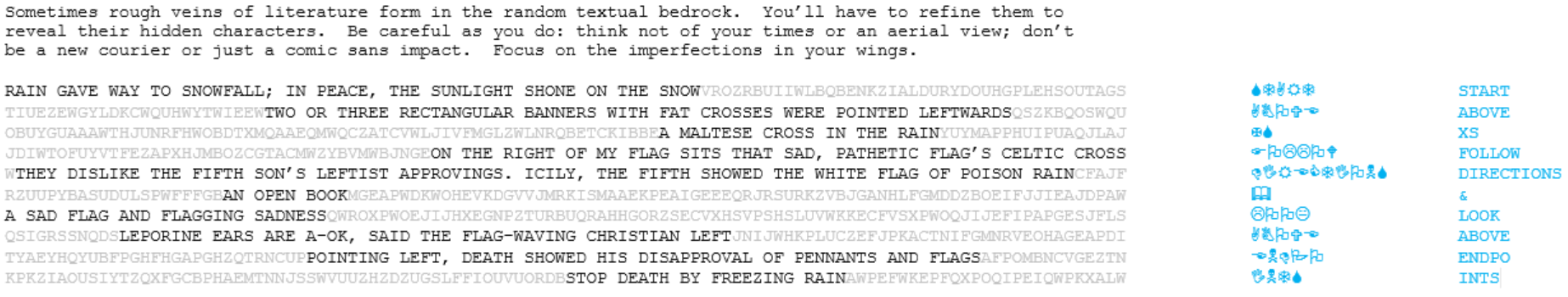The flavor text hints at different font names, with the final instruction referencing wingdings. In the block below, the coherent writing matches wingdings text letter by letter. For example, “RAIN” corresponded to a raindrop, wingdings for S, and “LEFTIST APPROVINGS” translated to a finger pointing left and a thumbs up, wingdings for EC. Fully translated, the wingdings spell “START ABOVE XS FOLLOW DIRECTIONS & LOOK ABOVE ENDPO-INTS.”